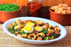 Embora seja consumido o ano inteiro, o tropeiro servido quentinho, com arroz branco, couve refogada e torresmo crocante, é um prato completo e encorpado — ideal para o frio.